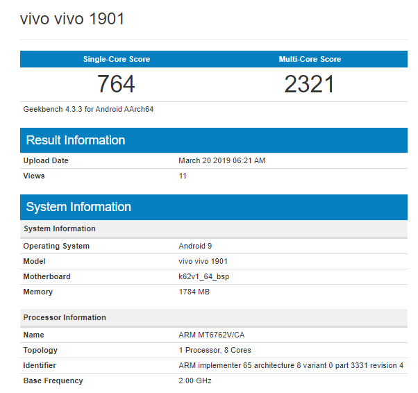 The Geekbench listing clearly shows the chipset in the Vivo 1901 as MediaTek’s MT6762V/CA. It is an octa-core processor, clocked at 2.0 GHz CPU. The device has 2GB of RAM, and it is running on the Android 9.0 Pie. Coming to the benchmark itself, the Vivo 1901 scored 764 points in Single-core test, and 2321 in the Multi-Core test. Considering the Geekbench score, we believe this chipset is MediaTek’s Helio A22 as the score matches with the Geekbench score of the Xiaomi’s Redmi 6A, which is also powered by the same chipset.