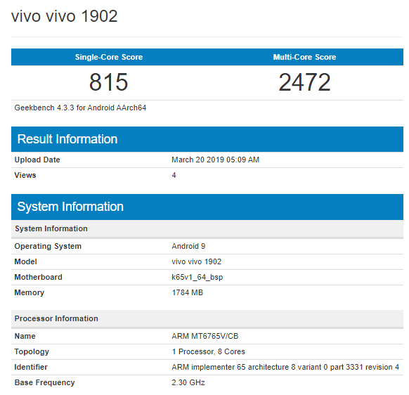 Talking about another phone, Vivo 1902, it is likely to employ MT6765V/CB octa-core processor (aka Helio P35) clocked at 2.30GHz. As per the Geekbench, the chipset is accompanied by 2GB of RAM and the phone boots Android 9 Pie. Furthermore, the handset scored 815 points in the single-core test and 2472 points in the multi-core test.