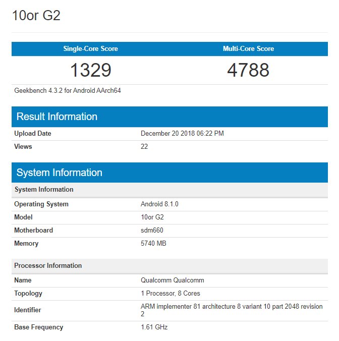 According to the results of Geekbench, 10.or G2 will be a mid-range smartphone, like its previous model. The device listed on Geekbench shows the device is running on Snapdragon 660 processor. However, this information is incorrect. Because, Snapdragon 660 is the base frequency which is lower than that of other SDM660-powered phones. The core scores are also lower. The 10.or G2 is actually powered by a Snapdragon 636 processor. To recall, the predecessor 10.or G is powered by Snapdragon 626. So Snapdragon 636 is still a significant update over its predecessor.