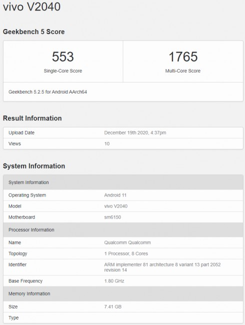 Vivo V20 (2021) has been listed bearing model number Vivo V2040. It runs the Android 11 operating system. According to Geekbench, the Vivo V20 (2021) scores 553 and 1765 in single-core and multi-core performance respectively. Based on the Geekbench listing, the Vivo V20 (2021) could use a Snapdragon 675 SoC (SM6150 mentioned in the motherboard section) under-the-hood, paired with 8GB of RAM.