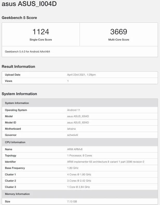 The ASUS ZenFone 8/ ZenFone 8 Pro spotted on Geekbench carries the model number as ASUS_I004D. If we go by the details on the Geekbench, we can see that the ASUS ZenFone 8/8 Pro will pack in Qualcomm Snapdragon 888 SoC. The smartphone could come with 8GB of RAM.