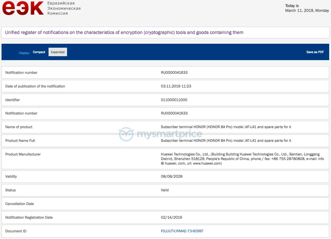 The report lists the Honor 8S as a model KSA-LX9 and along with the Honor 8S, EEC has also approved certification to the JAT-L41 variant of the Honor 8A Pro.