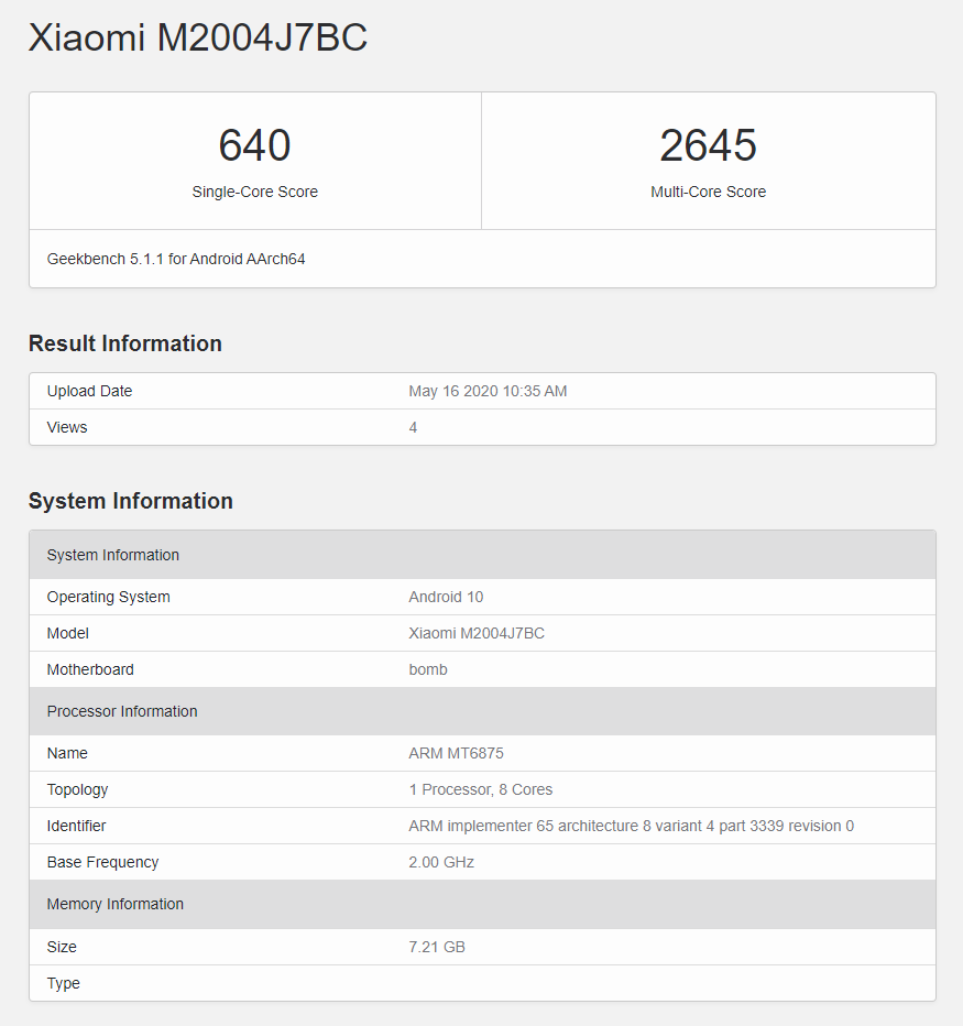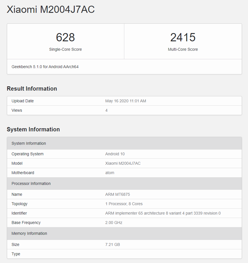 On a single-core test, the device with model number M2004J7AC has scored 628 points. In the multi-core test, it has scored 2415 points. The device with M2004J7BC, achieved a single-core score of 640 and a multi-core score of 2645.