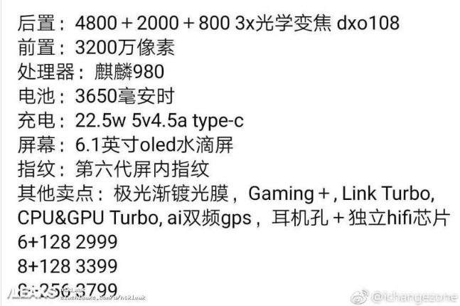 The smartphone is said to sport a 6.1-inch OLED display. It is expected to be powered by Kirin 980 SoC paired with 6GB/8GB of RAM and 128GB/256GB of internal storage. It will be fuelled by a 3,650mAh battery with support for 22.5W fast charge.