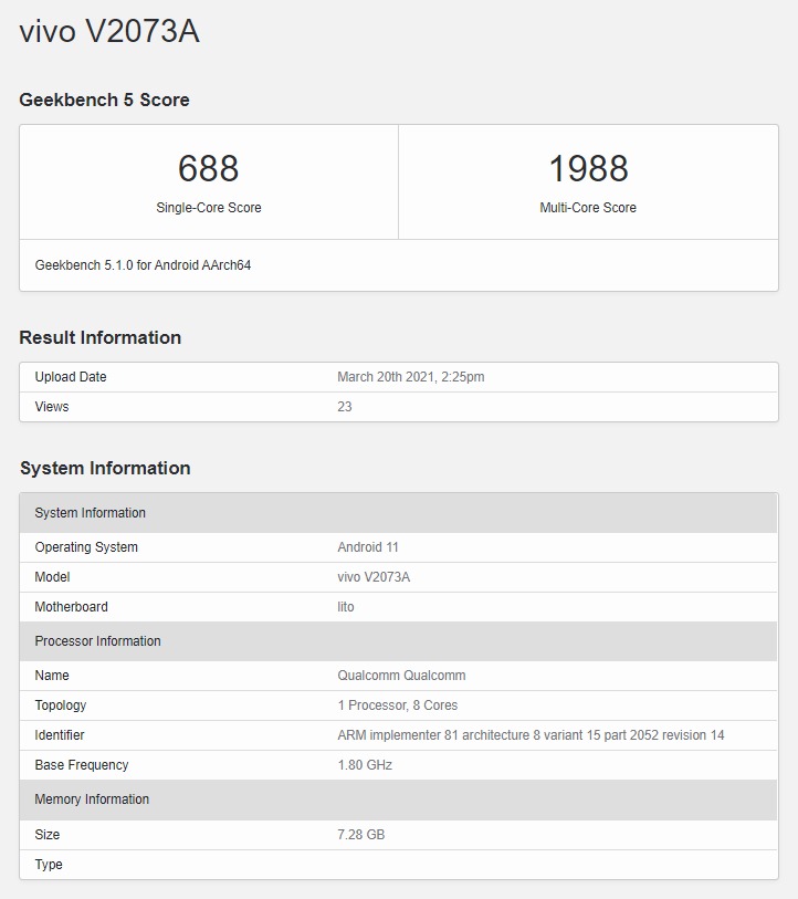It also suggests that the handset will be loaded with Android 11 OS. The processor has a 1.80GHz base frequency. The single-core test results are at 688, and the multi-core test results are at 1988.