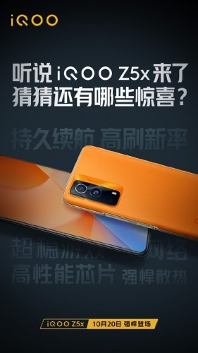Recently, Vivo’s sub-brand announced the iQOO Z5 and it is set to release a new device under the same Z-series. The handset, called the iQOO Z5x, will be unveiled in China on October 20.