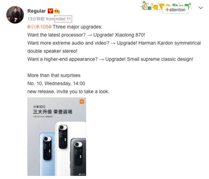 As per the teaser images shared by Xiaomi, the Mi 10S smartphone will feature a quad-rear camera setup arranged in a vertical manner. The camera housing has ‘108MP’ etched and what seems to be laser autofocus and an LED flash. The device has a volume rocker and power button on the right edge. The phone is likely to feature an in-display fingerprint scanner as the teaser images don’t show a fingerprint sensor. The brand further teased that the phone will come in Black, White, and Blue colour options. Moreover, a Xiaomi executive has confirmed the Mi 10S will be powered by the Snapdragon 870 SoC and Harmon Kardon speakers.