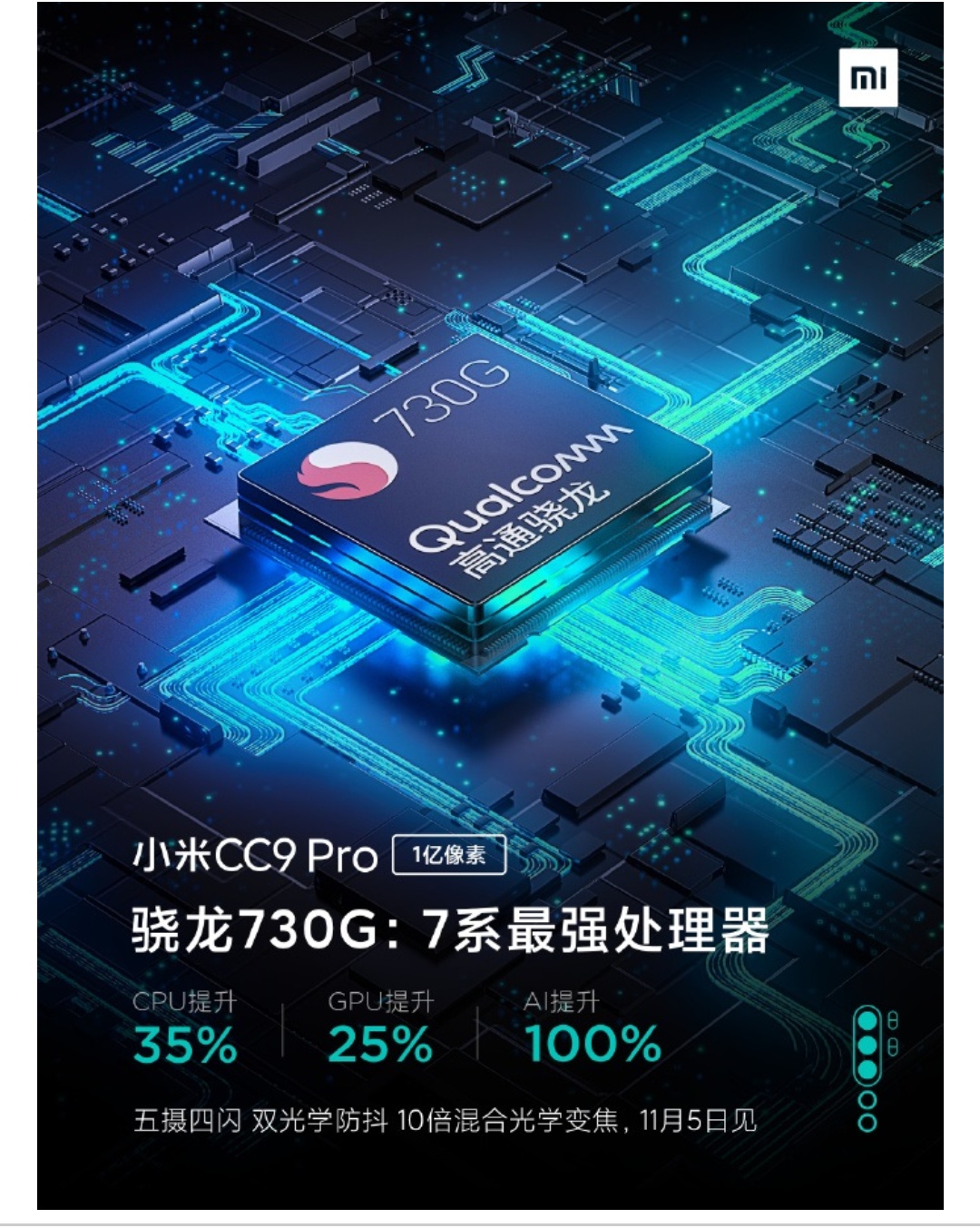 Xiaomi Mi CC9 Pro is confirmed to come with the Snapdragon 730G SoC through a new teaser posted by the Chinese brand on Weibo. The company is all set to launch the Mi CC9 Pro smartphone along with few other products on November 5 in China.