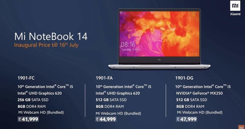 Xiaomi Mi NoteBook 14 (1901-FC) comes with a price tag Rs 41,999, while 1901-FA and 1901-DG models are priced at Rs 44,999 and Rs 47,999, respectively. The Mi NoteBook Horizon Edition costs Rs 54,999 (1904-AR) and Rs 59,999 (1904-AF) respectively. The latest laptops come equipped with Mi Webcam HD for free. The launch offers on the laptops include up to Rs 2,000 instant discount with HDFC Bank debit and credit cards. There is also a no-cost EMI options up to 9 months. Speaking about the availability, the new laptops will go on sale on June 17 on Mi.com, Amazon, Mi Home, and Mi Studios in India.