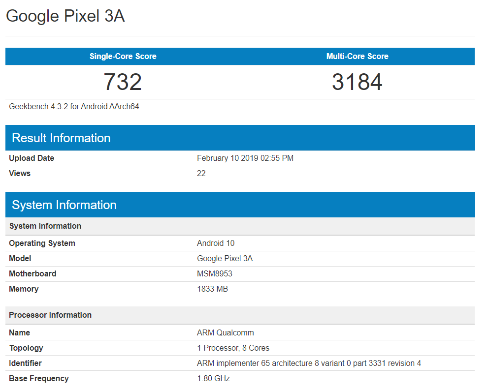 The latest benchmark spotting on Geekbench, point to the new Pixel 3A having 2GB of RAM. The alleged Pixel 3A has scored 732 and 3184 in single-core and multi-core tests respectively.