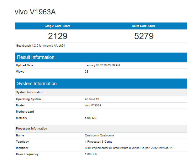 The Vivo V1963A scored single – core score of 2129 and a multi – core score of 5279. The Geekbench scores are low compared to the recently launched Oppo Reno3 Pro 5G which packs the same chipset.