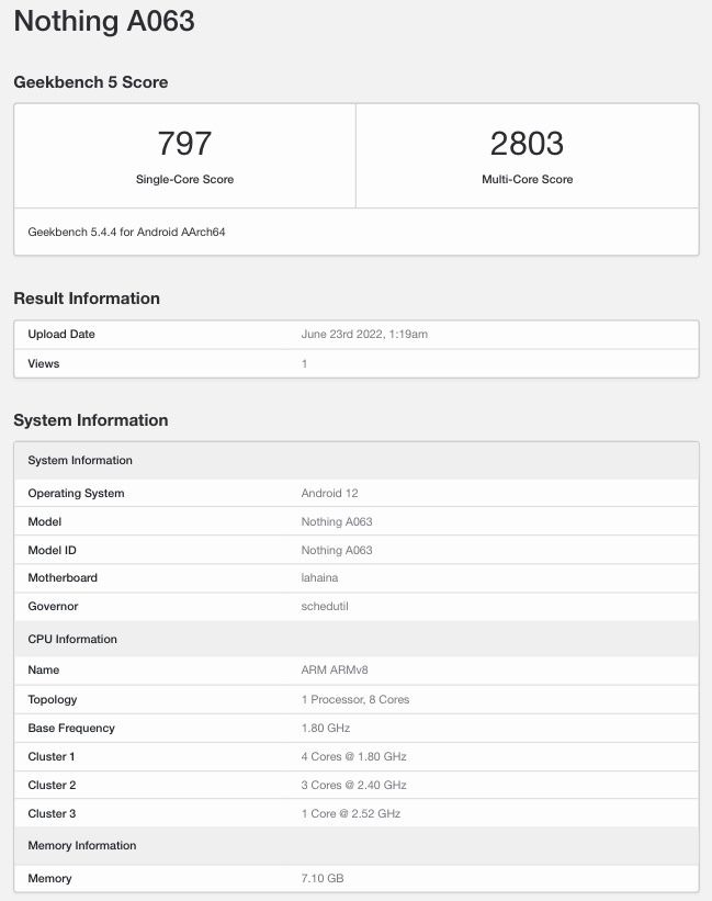 In the listing, Nothing Phone (1) has 8GB RAM and runs Android 12 OS out of the box. The phone will come with the NothingOS skin on top. On the Geekbench, the smartphone scored 797 points in a single-core test and 2800 points in a multi-core test.