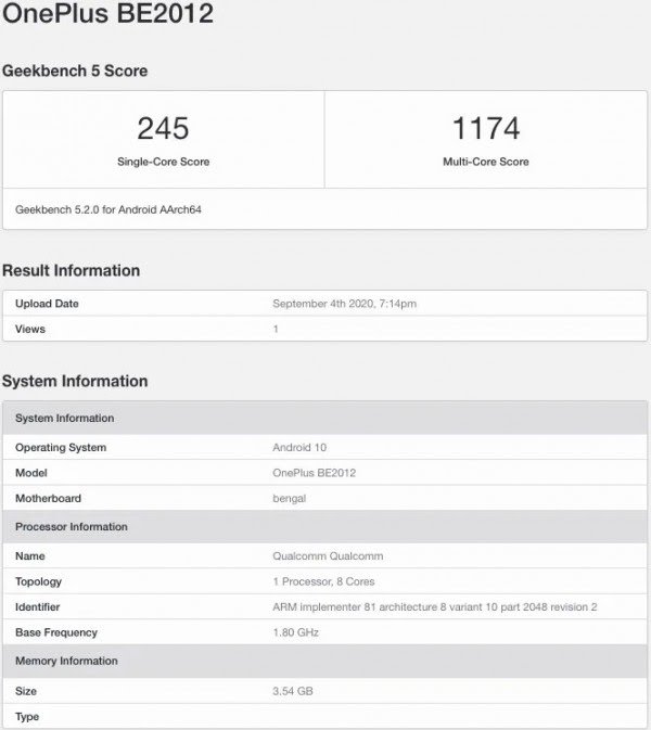 The OnePlus Clover was spotted on Geekbench’s website where it managed to post a score of 245 in the single-core test and 1174 in the multi-core test. This Geekbench result also tipped that the device will boot Android 10 OS out of the box which is as expected. It is tipped to be powered by a Qualcomm octa-core processor with a base frequency of 1.80GHz but the processor name is unknown. The motherboard field shows ‘bengal’.