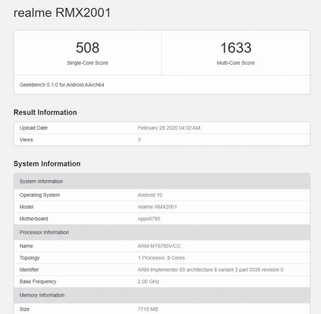 The Geekbench listing states the name of the device has model number RMX2061. It does not directly reveal the name of the processor. But, the processor has a base frequency of 2.00GHz, so it is MediaTek MT6785 chipset (aka Helio G90 chipset). Previous leaks and rumors suggested the variant would run a Snapdragon SoC but we now know this could be wrong.