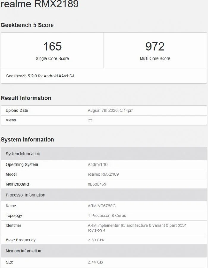 According to the Geekbench listing, the upcoming Realme C12 will pack a MediaTek MT6765G processor under the hood which is the Helio P35 SoC. The chipset has base frequently of 2.30GHz. The handset is coupled with 3GB of RAM and spotted running on the Android 10 OS out of the box.