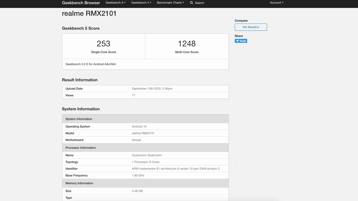 The listing on Geekbench reveals that the Realme C17 runs on Android 10 OS and that it has 6GB of RAM. The processor specs in the listing further confirm that the smartphone packs the Qualcomm Snapdragon 460 SoC. The device has been tested on Geekbench 5 and it has model number RMX2101.