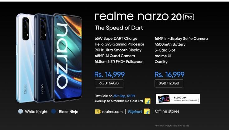Realme Narzo 20 Pro comes in White Knight and Black Ninja colours. The phone comes with a price tag of Rs. 14,999 for 6GB/64GB model and Rs.16,999 for 8GB/128GB model. It will be up for grabs starting from September 25 via Realme.in, Flipkart and offline stores.