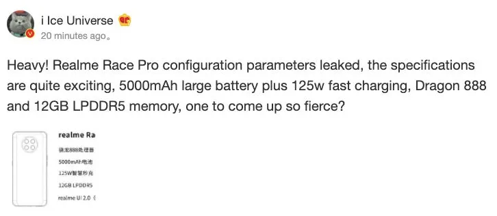 As per the latest leak, the Realme Race will come with a Qualcomm Snapdragon 888 SoC, and 12GB of LPDDR5 RAM, which was confirmed through tipster Ice Universe post on Chinese microblogging site Weibo.Realme Race Specs