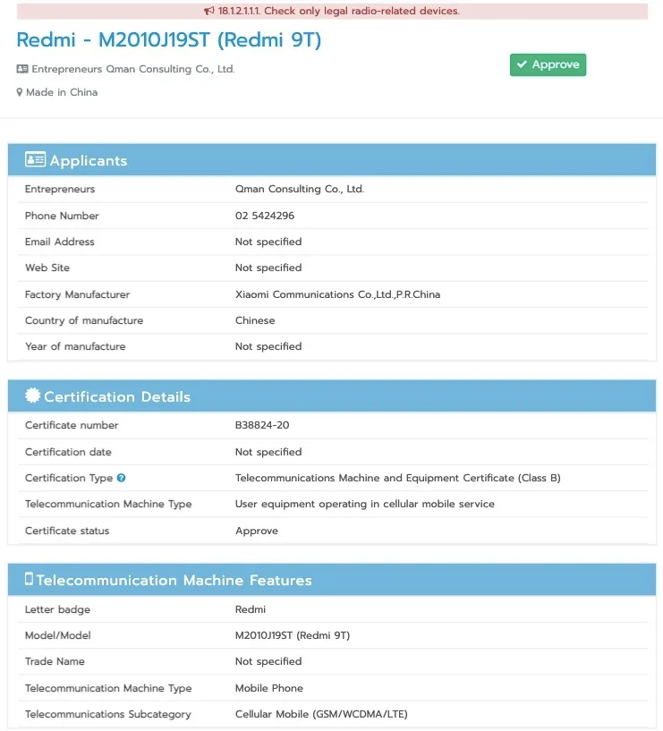Xiaomi is rumored to be working on yet another smartphone, which has appeared on Thailand’s NBTC certification database revealing its moniker. Redmi 9T has received certification from Thailand’s NBTC authority, showing the possible moniker of the device that carries model number M2010J19ST.