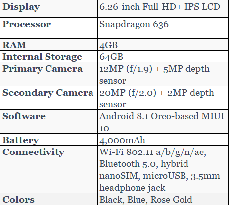 In terms of camera, the device got dual camera setup on the front and rear. the primary camera is a 12MP (f/1.9) and 5MP depth sensor and the back camera setup is sported with a 20MP(f/2.0) and 2MP depth sensor. It runs on Android Oreo-based MIUI 10. The device will be available in color variants Black, Blue and Rose Gold.