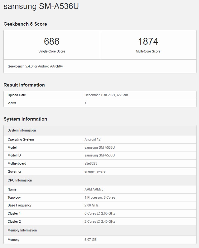 The Galaxy A53 appears on Geekbench 5 with the model number SM-A536U. This phone is powered by an Exynos chip with the model number “s5e8825”. It has six CPU cores clocked at 2.0GHz and two CPU cores clocked at 2.40GHz. The chip model number indicates that the handset may be powered by Samsung’s upcoming Exynos 1200 chip. The listing’s source code reveals that the SoC includes a Mali-G68 GPU.