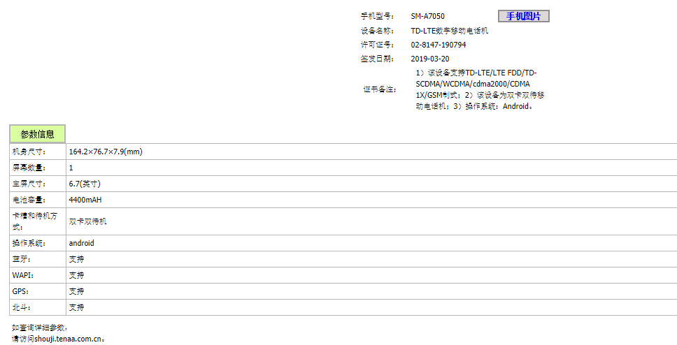 As you can see in the image of the Samsung Galaxy A90 in the TENAA listing, the device is equipped with a triple-rear camera setup. As per the listing, the Samsung Galaxy A70 is listed with the model number SM-A7050. The new Samsung Galaxy A70 will sport 6.7 inches Super AMOLED Full HD+ infinity-V display similar to the Galaxy M series.