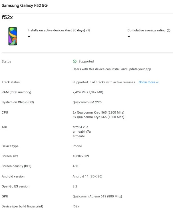 As per the Google Play Console listing, the alleged Samsung Galaxy F52 5G is said to come with the Android 11 operating system out of the box. Google Play Console listing suggests it will arrive with 450 DPI and Full HD+ display, bearing a resolution of 1080 x 2009 pixels. We do not know the size of the screen. The octa-core Snapdragon 750 SoC (SM7225) SoC will be backed by 8GB RAM. Nevertheless, there may be other RAM variants as well.