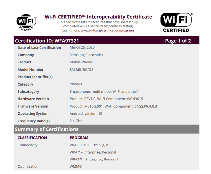 The Samsung Galaxy M01 has received Wi-Fi certification and the certification documents don’t reveal a lot of information about the Galaxy M01 but what we do know is that the device will have 2.4GHz frequency bands for Wi-Fi and will ship with Android 10 OS. The phone bears an SM-M015G/DS model number.