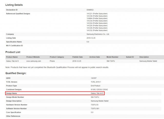 Based on leaked info, the Samsung Galaxy Tab A4 S will have a model number SM-T307U. The tablet is listed as containing Bluetooth 5.0 and other details are not revealed through the listing.