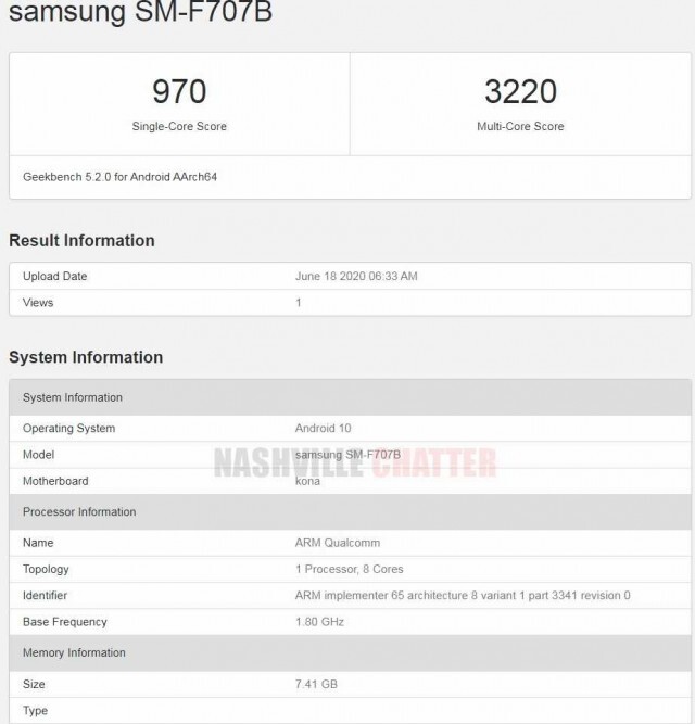 Also clear from the screenshot above is that the alleged Samsung Galaxy Z Flip 5G comes with 8GB of RAM and that it runs Android 10 OS. Looking at the name of the motherboard (Kona), we assume that the phone uses the Qualcomm Snapdragon 865 SoC. The device listed on Geekbench managed a single-core score of 970 points and a multi-core score of 3,220 points.