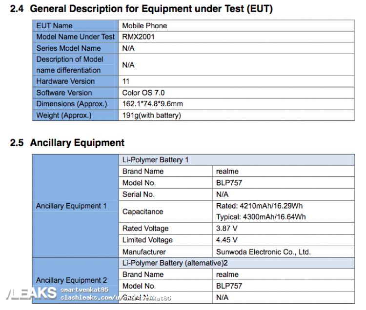 As per the FCC update, the Realme RMX2001 measures 162.1 x74.8 x 9.6mm. Further, it has been revealed that the phone will weigh 191 grams. Going by the schematic diagram of the Realme RMX2001, the device will also have a volume keys on the left edge and power button on the right edge. Furthermore, it is confirmed to pack a 4,300mAh battery and is preinstalled with ColorOS 7.