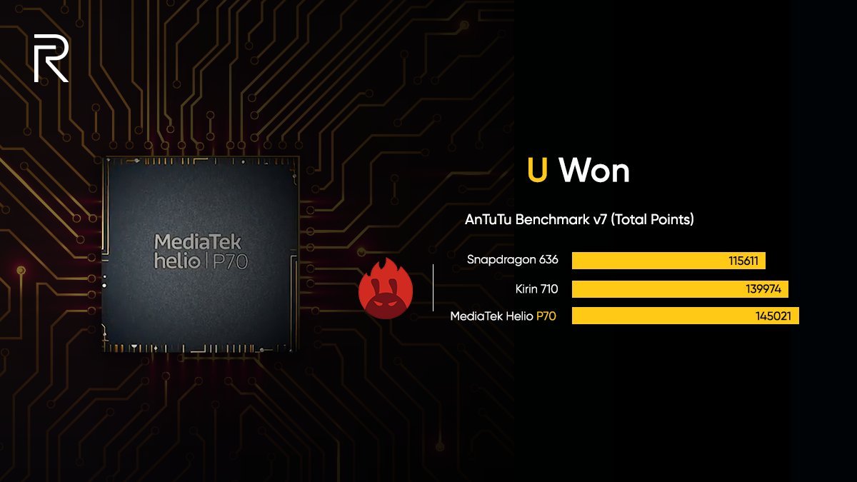 Now in another tweet from the company, RealMe showed off the AnTuTu score of Realme U1’s MediaTek Helio P70 SoC, comparing it with AnTuTu scores of Qualcomm Snapdragon 636 and HiSilicon Kirin 710, the two chipsets that power Xiaomi Redmi Note 6 Pro and Honor 8X, respectively. The Redmi note 6 Pro and the Honor 8X are the two competitors of the RealMe’ upcoming RealMe U1.
