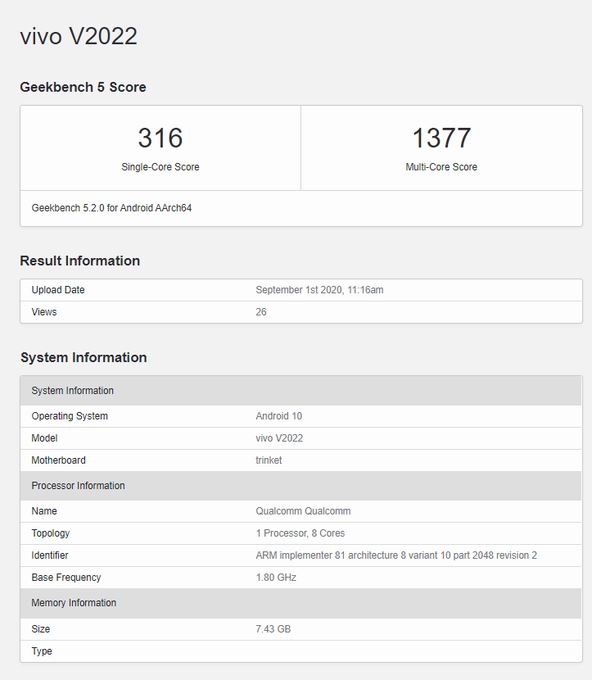 As revealed by the report, the benchmark listing shows a alleged Vivo V20 SE which packs in a Qualcomm Snapdragon 665 chipset and 8GB of RAM. Also revealed through the benchmark is the Android version that the smartphone is currently being tested with and that would be Android 10 OS. With that setting, the handset scored 316 points in the single-core test and 1,377 in the multi-core test.