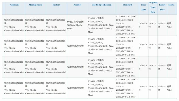 These three smartphones are spotted on China’s 3C certification authority website with model numbers V2059A, V2047A, V2046A and they will support 5G connectivity. Also, all of them together support charging up to 33W(11V dc at 3A Max).
