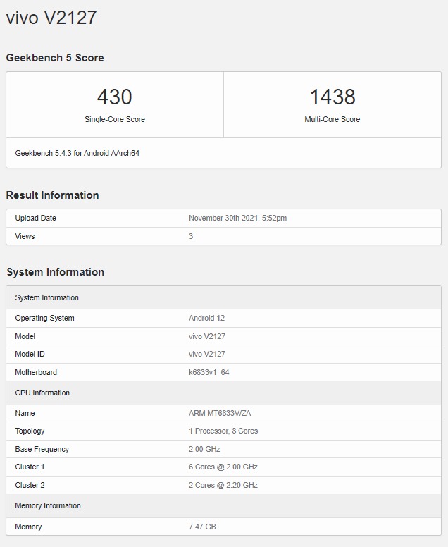The phone will come with Android 12 preinstalled with Funtouch OS 12 or Origin OS, depending on the region. The phone managed to score 430 in the single-core test and 1438 in the multi-core test.