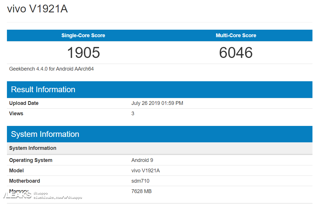 The phone looks to be running on Android 9 Pie OS out of the box. In the benchmark test, the Vivo V1921A is seen to score 1905 and 6046 in the single-core and multi-core benchmarking tests respectively.