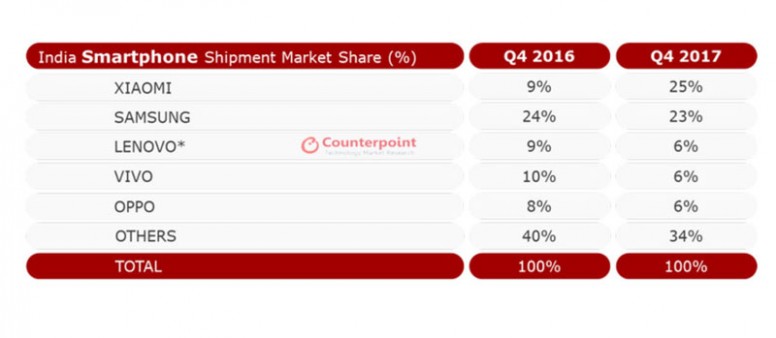 It is a classic case study of a brand which was not present in the market three years back, is now Number 1 brand in India. As per the latest data shared by counterpoint research, Xiaomi has 25% share followed by Samsung with 23% market share. Lenovo, Oppo, and Vivo have lost share in the market in the Q4 2017.