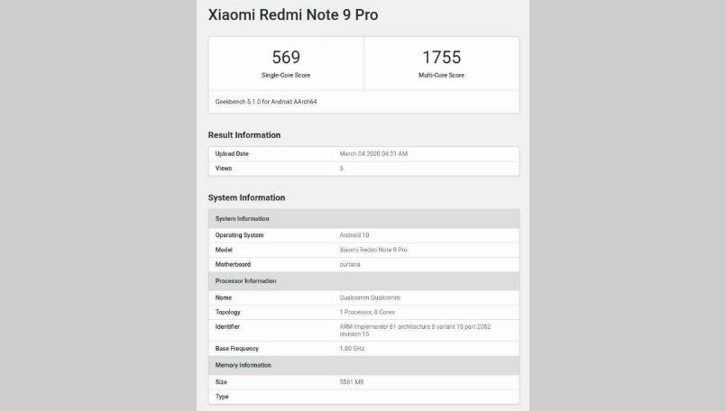 We also have information about the Redmi Note 9 Pro software. According to Geekbench, it will ship with Android 10 OS with MIUI skin on the top.